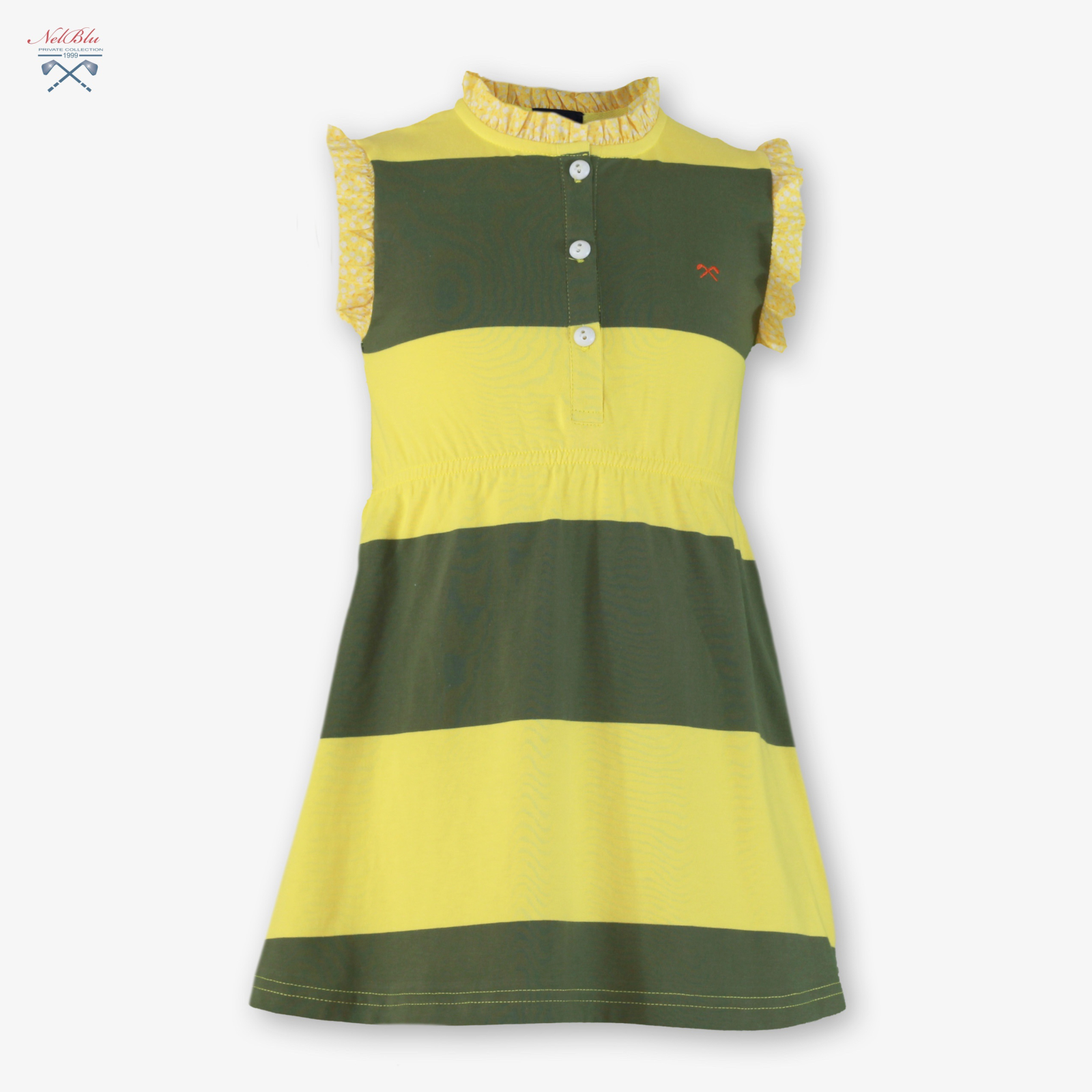 Guler si maneci: Margini cu volane mici, de culoare galbena, care adauga un plus de feminitate.