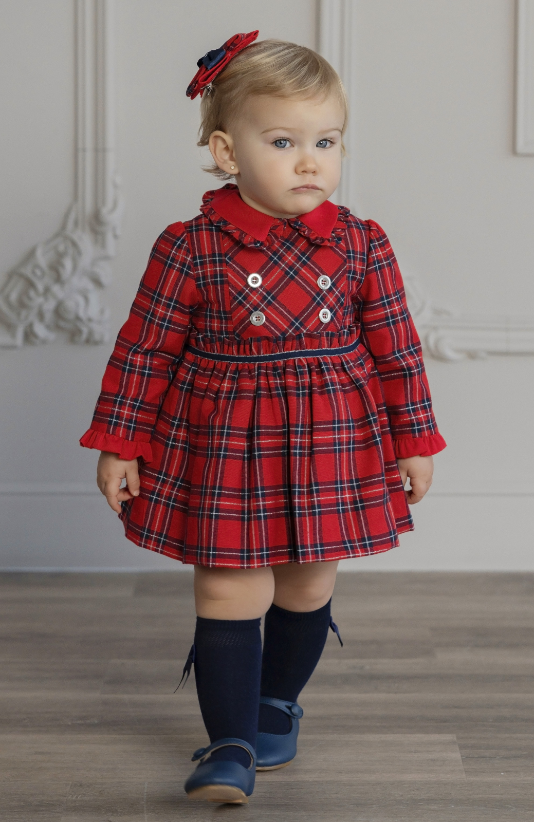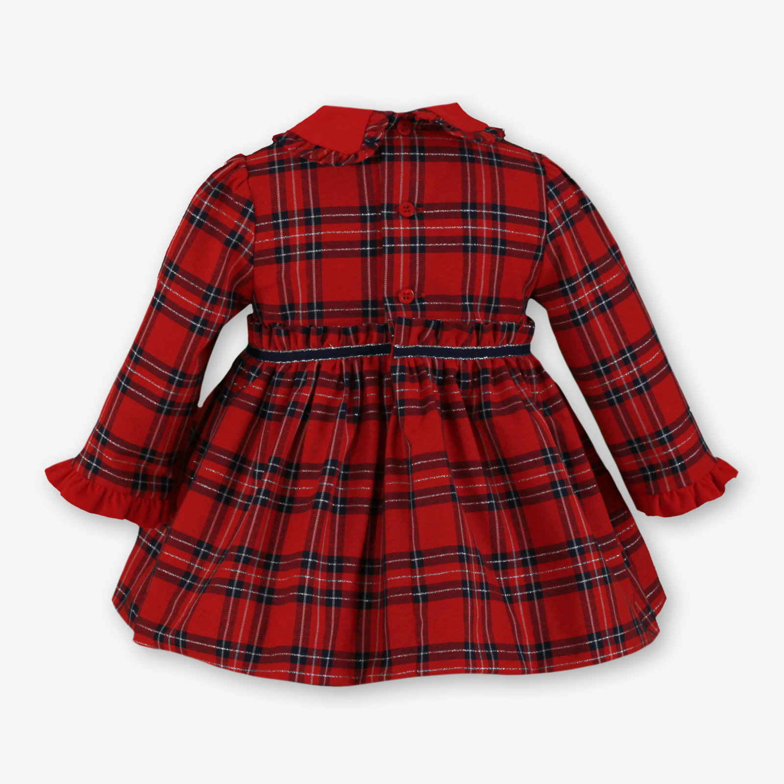 Rochiță elegantă pentru fetițe, cu mâneci lungi și imprimeu clasic tartan în nuanțe de roșu. Are guler decorativ, volănașe discrete și nasturi dubli în față, oferind un aspect festiv și adorabil — perfectă pentru sărbători sau ocazii speciale.